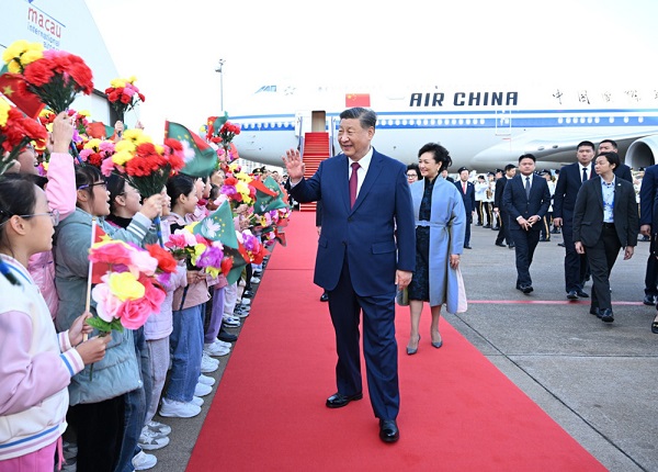 16时许,习近平乘坐的专机徐徐降落在澳门国际机场。习近平和夫人彭丽媛走出舱门,向欢迎人群挥手致意。澳门警察乐队奏响热情洋溢的欢迎曲,舞龙舞狮表演喜气欢腾。舷梯旁,两名少年儿童向习近平和彭丽媛献上鲜花。在澳门特别行政区行政长官贺一诚和夫人郑素贞陪同下,习近平和彭丽媛同前来迎接的人员亲切握手。数百名澳门青少年和各界群众代表挥动国旗、特别行政区区旗和鲜花,表达热烈的欢迎。