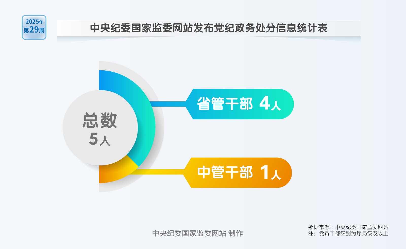 2025年第29周,中央纪委国家监委网站共发布5条党纪政务处分信息。其中,中管干部1人,省管干部4人。