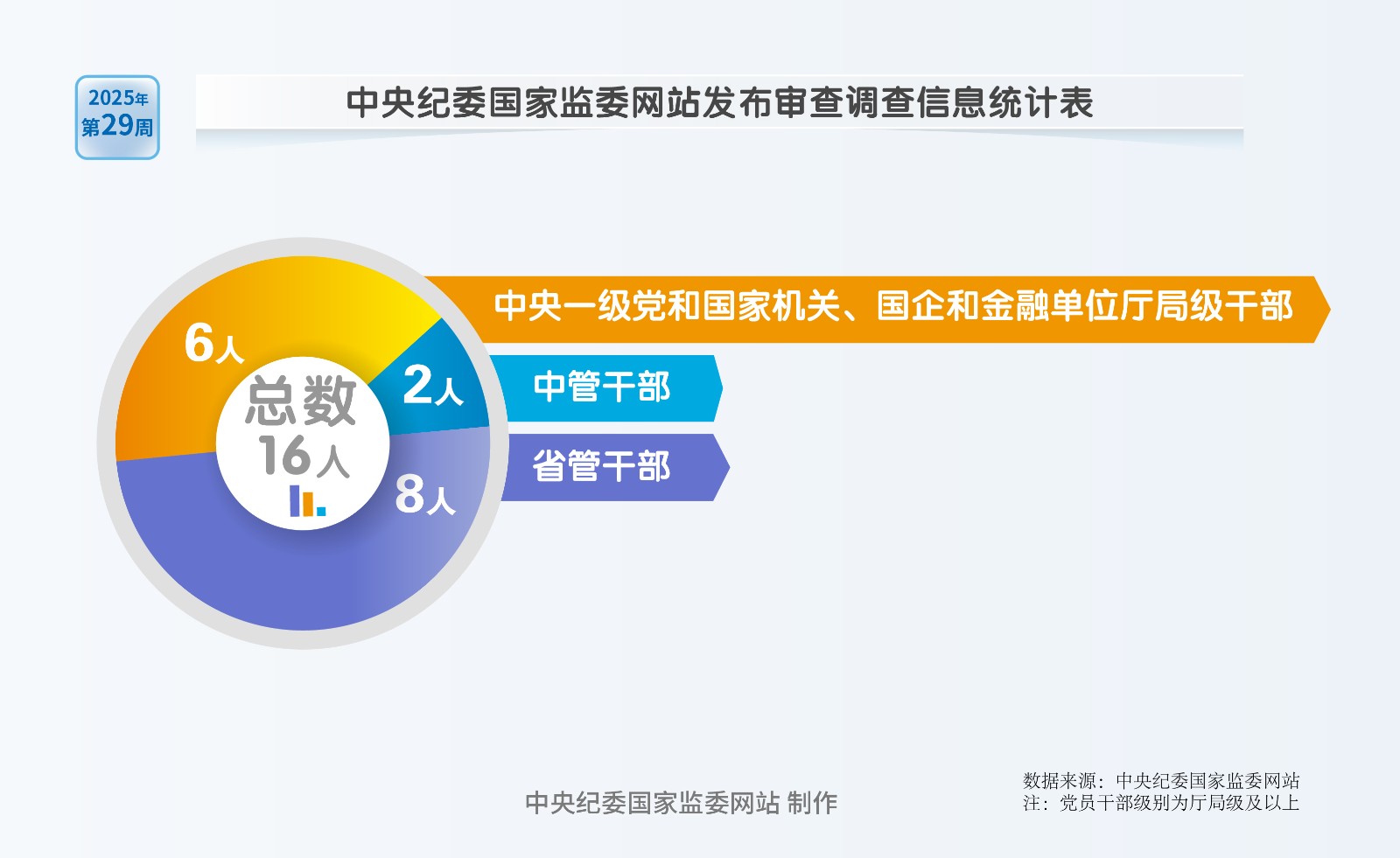 2025年第29周,中央纪委国家监委网站共发布16名党员领导干部接受审查调查信息。其中,中管干部2人,中央一级党和国家机关、国企和金融单位干部6人,省管干部8人。