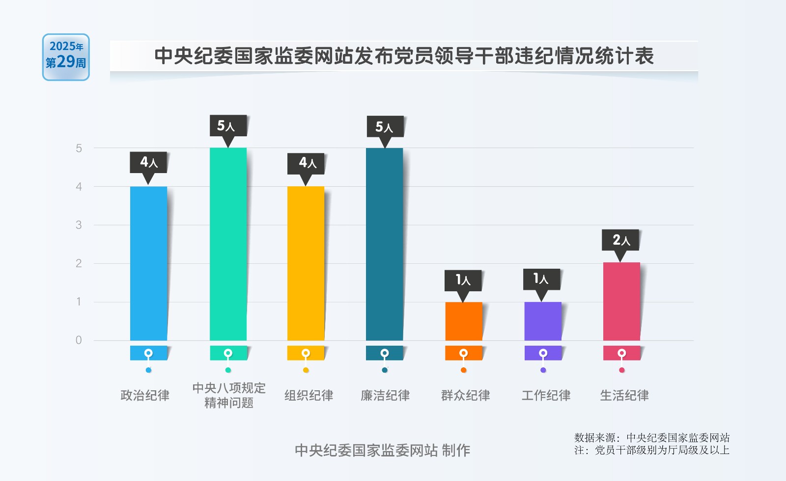 2025年第29周,在中央纪委国家监委网站发布的党纪政务处分信息中,4人违反政治纪律,5人违反中央八项规定精神问题,4人违反组织纪律,5人违反廉洁纪律,1人违反群众纪律,1人违反工作纪律,2人违反生活纪律。
