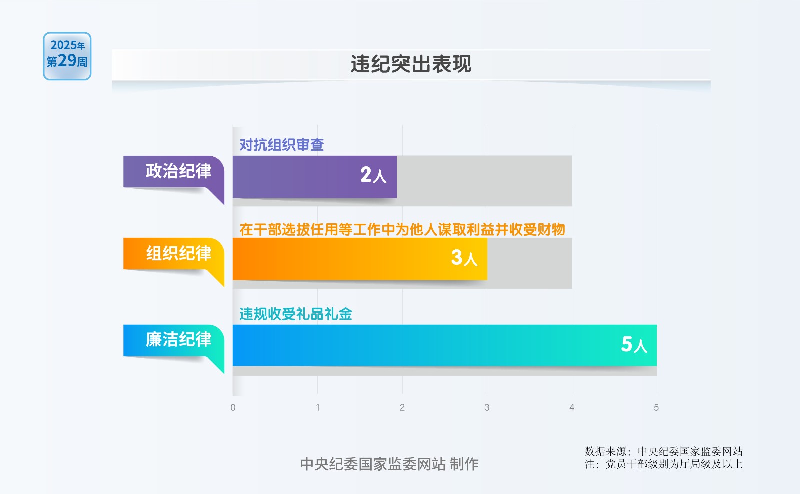 2025年第29周,中央纪委国家监委网站通报的5名被处分党员领导干部中,有4人存在违反政治纪律问题,2人存在“对抗组织审查”行为;在违反组织纪律行为中,3人存在“在干部选拔任用等工作中为他人谋取利益并收受财物”,占比最高;在违反廉洁纪律行为中,5人均存在“违规收受礼品礼金”行为。