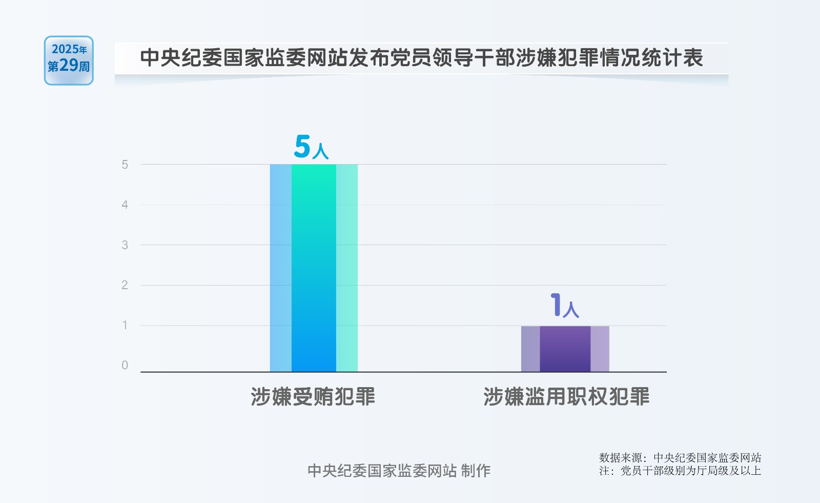 中央纪委国家监委网站2025年第29周发布的党纪政务处分信息中,5名被处分党员领导干部均构成严重职务违法并涉嫌受贿犯罪,其中被指1人涉嫌滥用职权犯罪。