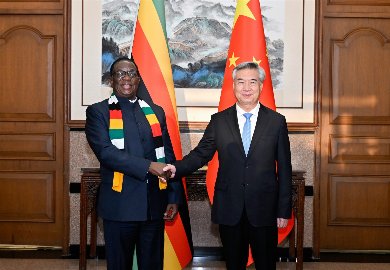 9月4日,中共中央政治局常委、中央纪委书记李希在北京会见来华出席纪念中国人民抗日战争暨世界反法西斯战争胜利80周年活动的津巴布韦总统姆南加古瓦。 新华社记者 岳月伟 摄