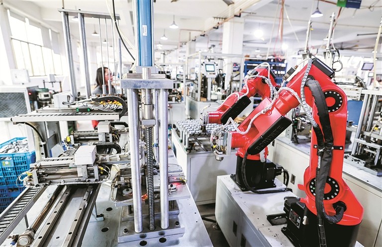 近年来,浙江省金华市金东区以高能级平台建设为支撑,积极推动科技创新与产业创新深度融合,深化“3+3”主导产业培育、优质人才培育,为企业创新发展提供全方位支持,助力新质生产力发展。图为近日,在位于该区的金华精研机电股份有限公司车间内,自动化流水线上在生产充气泵。 新华社记者 徐昱 摄