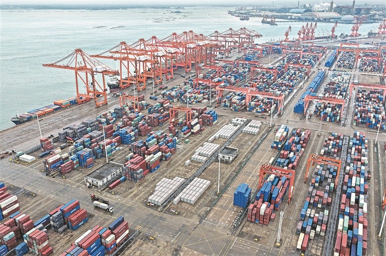 时下,广西北部湾港钦州港区码头桥吊、龙门吊等自动化设备有序运转,车辆来往穿梭,港口货运呈现一派繁忙景象。图为3月4日拍摄的广西北部湾港钦州港区码头。新华社记者 周华 摄